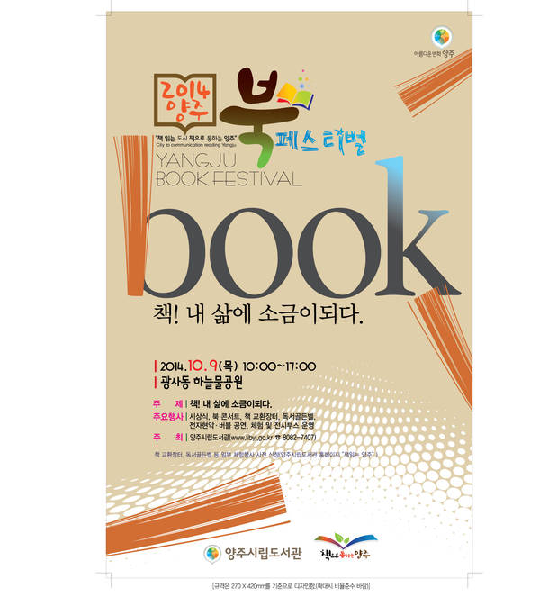 양주시는 오는 9일 광사동 하늘물공원에서 “책! 내 삶의 소금이 되다”라는 주제로「2014 제3회 양주 북페스티벌」을 개최한다.
