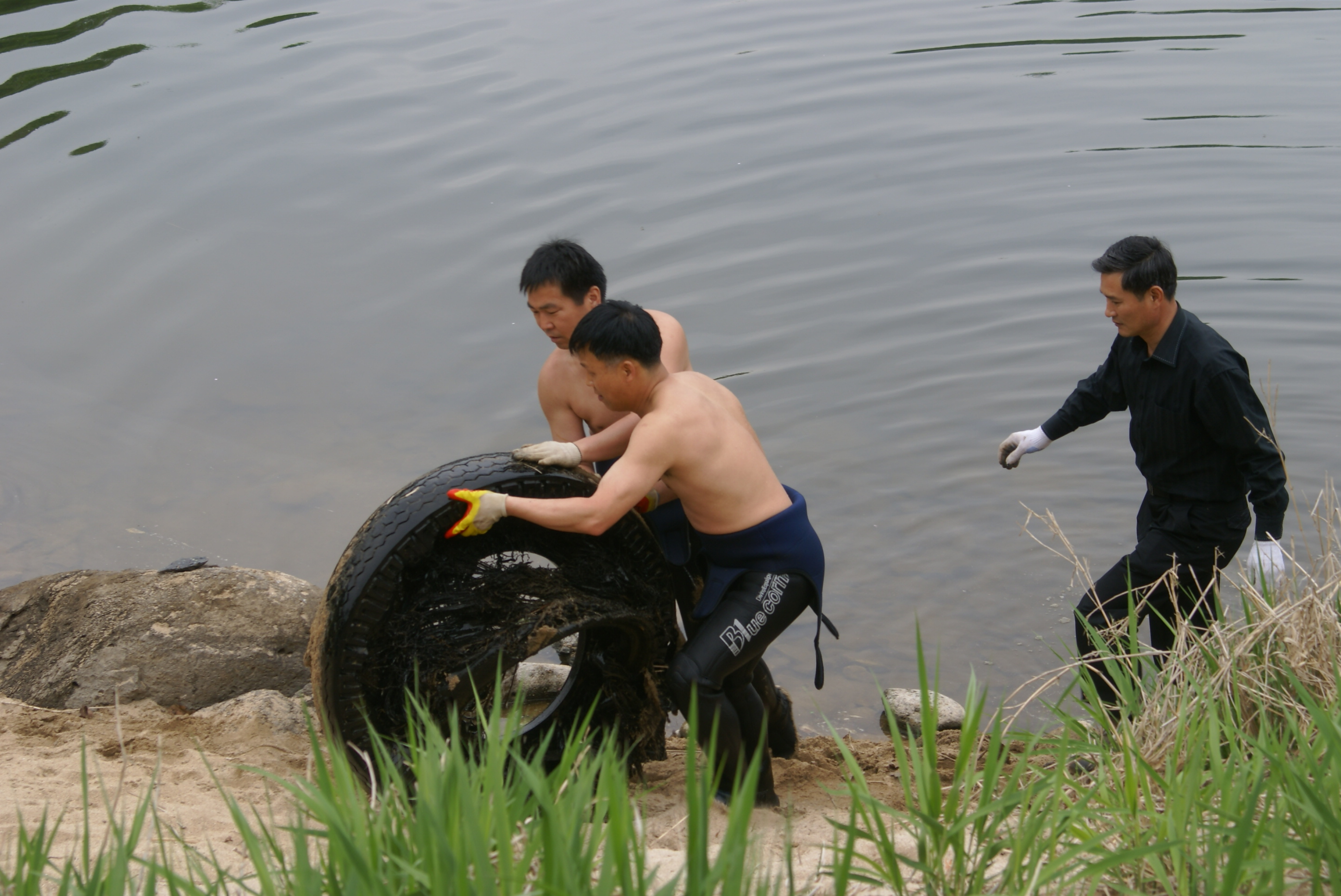 이번 수거활동을 통해 버려진 폐타이어, 폐그물, 영농폐기물 등 약 1톤의 수중 쓰레기를 수거했다.