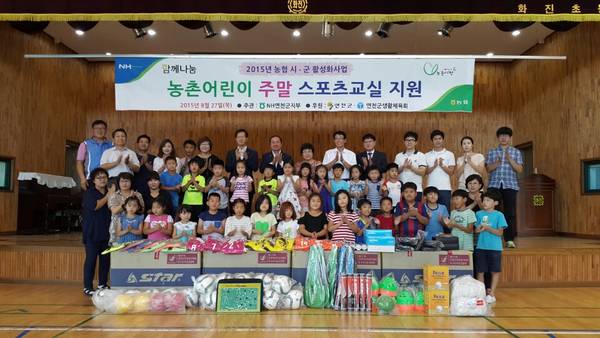 NH농협 연천군지부(지부장 남헌모)는 27일 연천군 관내 화진초등학교 운동장에서 경제적으로 어려운 농촌 어린이들을 대상으로 ‘농촌 어린이 주말스포츠교실 지원사업’ 물품 전달식을 가졌다.