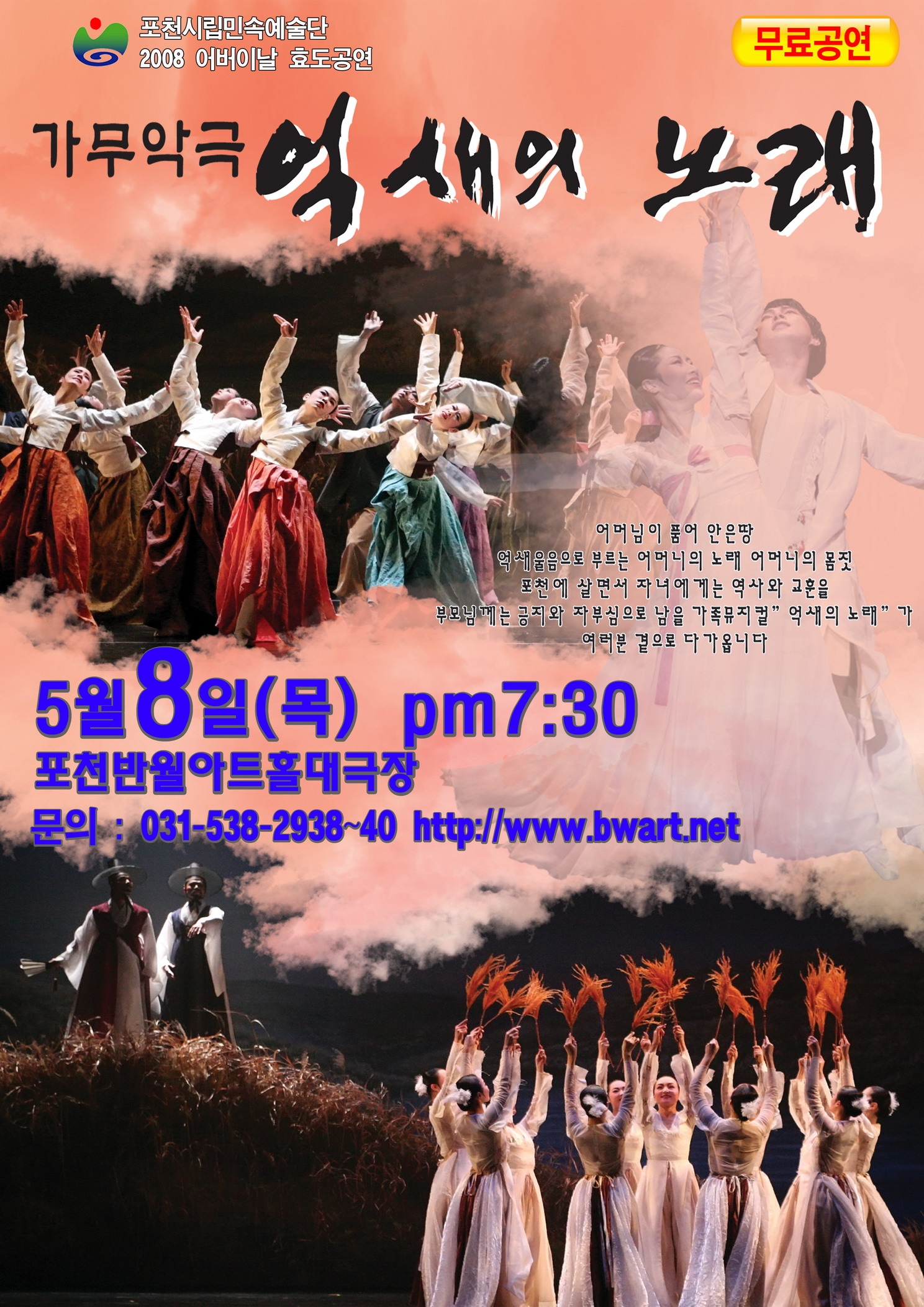 포천시는 8일 어버이날을 맞이해 반월아트홀에서 포천시립민속예술단 가무악극 ‘억새의 노래’를 무료로 공연한다.