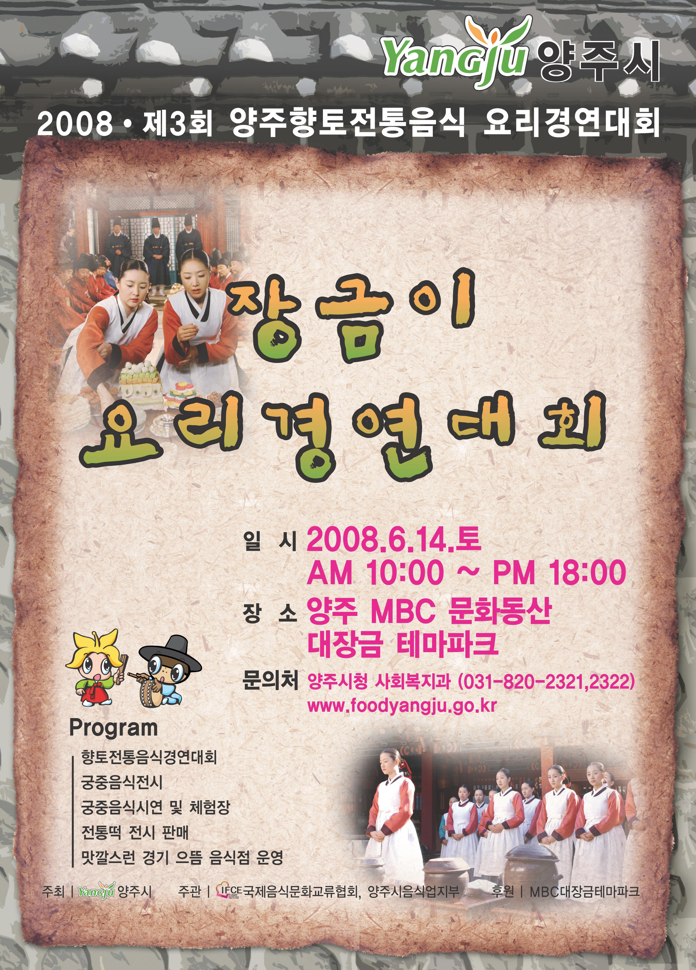 양주시는 지역 관광명소로 자리 잡고 있는 MBC 대장금 테마파크와 연계한“제3회 향토전통음식요리경연대회”를 오는 6월 14일 개최한다.