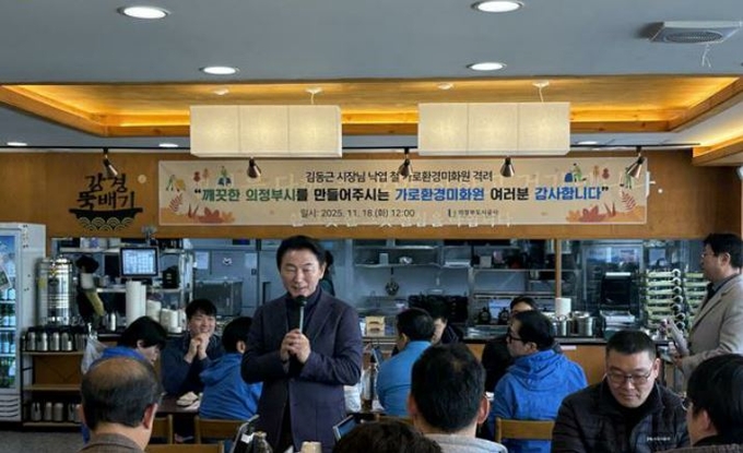 김동근 의정부시장은 가을철 낙엽 증가로 업무가 크게 늘어난 가로환경미화원들을 격려하기 위해 지난 18일 오찬 간담회를 열고 현장 의견을 들었다.