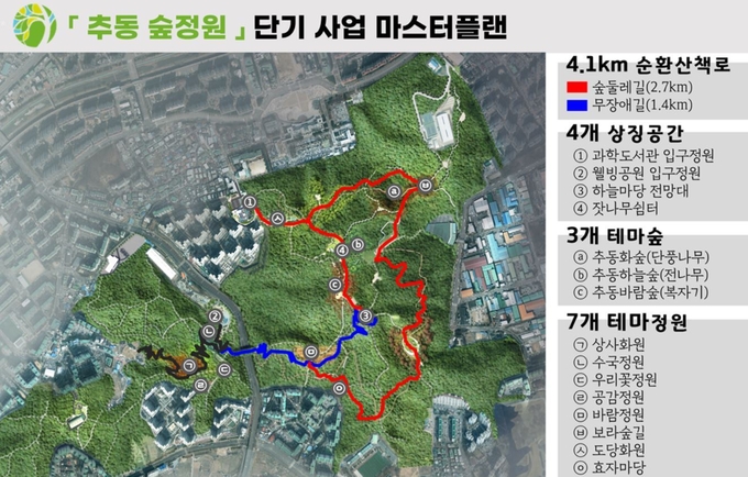 시는 이후 2027년부터 중장기 사업을 추진해 메타세쿼이아와 자작나무 숲을 조성하고, 송산배수지 방향 무장애길을 연장하는 한편 잔디마당과 힐링정원, 소풍정원, '추동 책뜰' 등 다양한 휴식 공간을 추가로 마련할 계획이다.