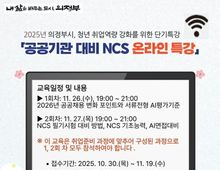 의정부시는 청년 구직자의 공공기관 취업역량 강화를 위해 '공공기관 대비 NCS 온라인 특강' 참여자를 모집한다고 30일 밝혔다. 이번 특강은 11월 26일과 27일 양일간 실시간 비대면 방식으로 진행되며, 공공기관 취업을 준비하는 청년들에게 최신 채용 트렌드와 실질적인 대비 전략을 제공할 예정이다. 교육 내용은 ▲2026년 공공채용 제도 변화 포인트 ▲8대 공공기관 채용 특징 ▲서류전형 AI 평가 기준 ▲NCS 필기 유형 분석 ▲AI 면접 대응 전략 등으로 구성돼 있다. 참여 대상은 의정부시에 주소를 둔 19세 이상 39세 이하 청년으로, 대학생과 취업준비생 모두 신청할 수 있다. 신청은 11월 19일까지 의정부시 누리집 또는 일자리종합지원센터 블로그를 통해 온라인으로 가능하며, 자세한 사항은 시 일자리종합지원센터로 문의하면 된다. 이부근 일자리경제과장은 "공공기관 채용 환경이 빠르게 변화하고 있는 만큼, 이번 특강이 청년들의 실질적인 취업 준비에 도움이 되길 바란다"며 "앞으로도 청년층 맞춤형 일자리 지원 프로그램을 적극 확대해 나가겠다"고 말했다.