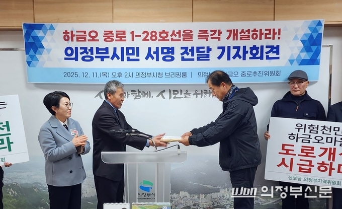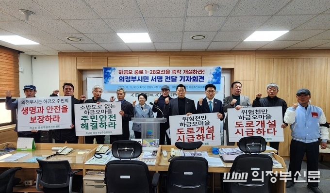 의정부 하금오 중로추진위원회가 11일 시청 기자실에서 기자회견을 열고 30년 넘게 개설이 지연된 폭 20m, 총연장 720m의 '중로 1-28호선' 사업을 즉각 추진할 것을 요구했다. 위원회는 주민 880명의 서명을 시에 제출하며 "이 문제는 더 이상 미룰 수 없는 주민 안전의 문제"라고 목소리를 높였다.