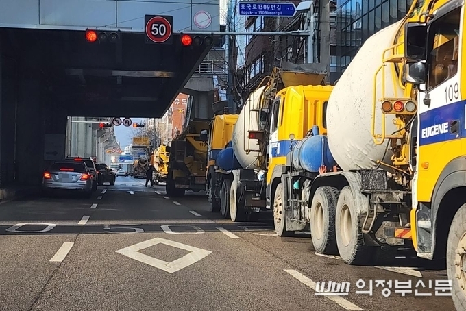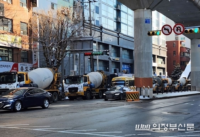 2일 취재에 따르면, 의정부 중앙초등학교 내 교육연구시설 개축공사 현장 인근 대로에 10여 대가 넘는 레미콘 차량이 도로 한 차선을 장시간 점거한 채 대기하고 있는 모습이 확인됐다.
