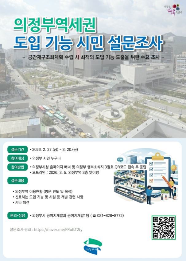 참여는 QR코드를 통해 가능하며, 해당 코드는 시정소식지 '행복소식'과 시 누리집 배너에 게재된다. 오는 3월 5일에는 의정부역 일원에서 현장 설문도 병행해 온라인 참여가 어려운 시민 의견을 직접 수렴할 예정이다.