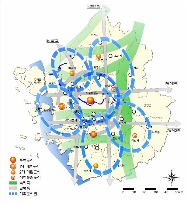 수도권의 개발축이 서남부와 동북부로 바뀐다. 또 수도권에 선진국형 지식경제체제가 구축돼 국가의 성장동력이자 동북아의 중심도시로 육성된다.