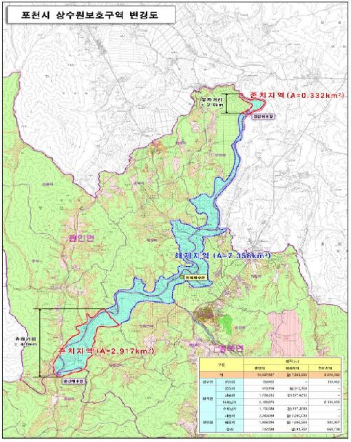경기도 포천시는 상수원보호구역 가운데 70%가량에 해당하는 7.36㎢를 해제 했다고 밝혔다.