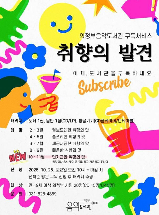 '텁지근한 취향의 맛' 구독 신청은 오는 25일 오전 10시부터 음악도서관 방문 선착순 접수로 진행된다. 자세한 내용은 의정부음악도서관 홈페이지 또는 전화로 문의할 수 있다.