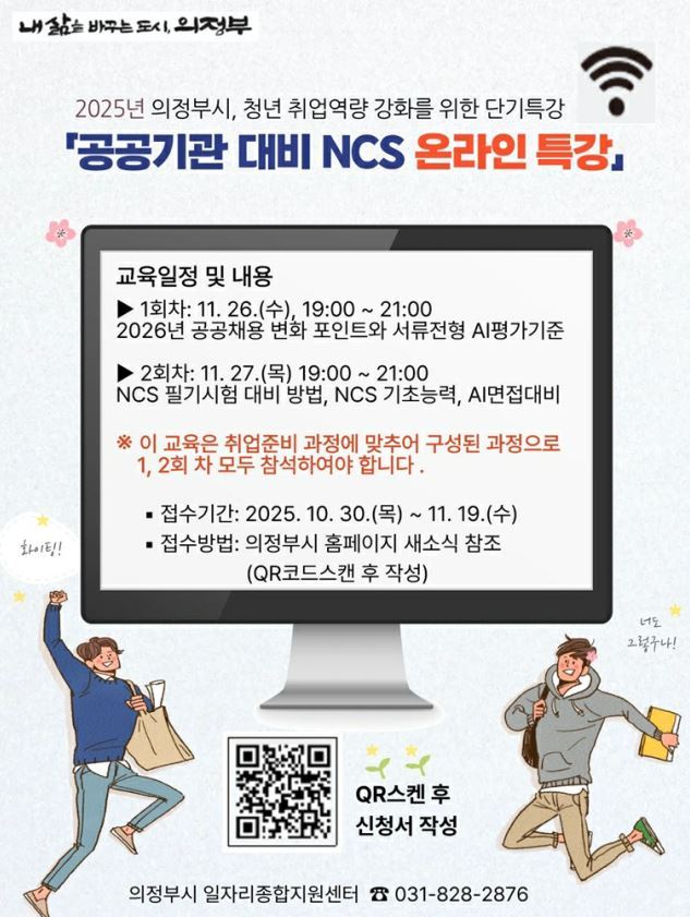 의정부시는 청년 구직자의 공공기관 취업역량 강화를 위해 '공공기관 대비 NCS 온라인 특강' 참여자를 모집한다고 30일 밝혔다.