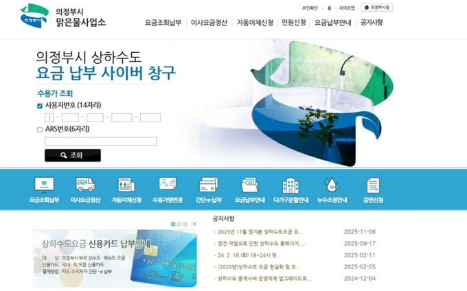 이용 방법은 '의정부시 상하수도요금 누리집'에 접속한 뒤 '요금조회→납부 조회' 메뉴에서 사용자 인증을 거치면 된다.