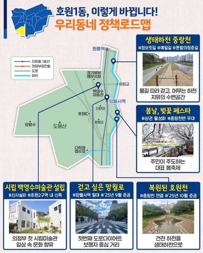 의정부시가 시민 생활과 밀접한 행정, 인프라, 문화, 복지 정보를 한눈에 볼 수 있는 '우리동네 정책로드맵' 호원1동편을 7일 공개했다.