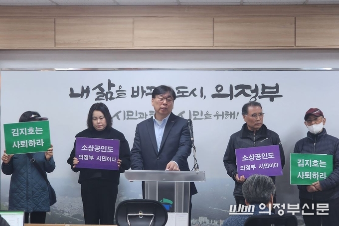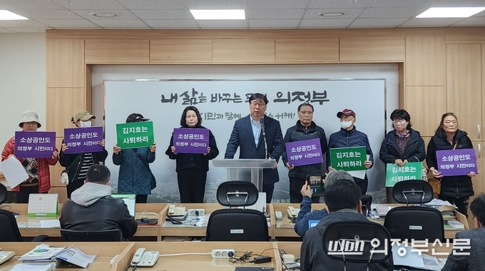 의정부 금오동 상인들이 13일 시청 기자실에서 기자회견을 열고, 최근 시정질의에서 지역 후원 행사에 '이해충돌'을 언급한 김지호 시의원이 상권 활성화 노력과 후원 기업의 선의를 훼손했다며 강하게 반발하고 사퇴를 촉구했다.