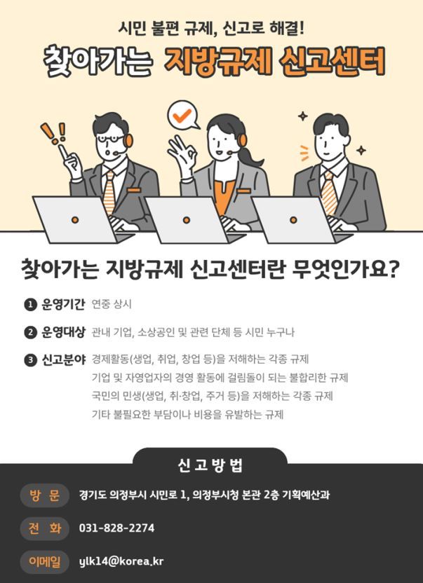 의정부시는 시민의 일상생활과 기업 활동을 저해하는 불합리한 규제를 현장에서 발굴·개선하기 위해 '찾아가는 지방규제 신고센터'를 연중 상시 운영한다고 12일 밝혔다.