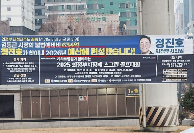 정 의원은 최근 시청 앞과 호원동 일대 대로변에 '의정부 재정자주도 꼴등(경기도 31개 시·군 중 31위) 김동근 시장의 불법 예비비 634억, 정진호가 찾아내 2026년 예산에 편성'이라는 문구가 적힌 현수막을 내걸었다.
