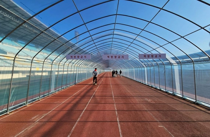 의정부시는 동절기에도 시민들이 안전하고 쾌적한 환경에서 운동할 수 있도록 의정부종합운동장 주경기장 내 400m 육상트랙 구간에 비닐하우스 형태의 '비닐트랙'을 설치했다고 5일 밝혔다.