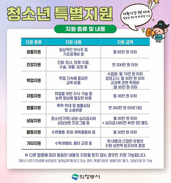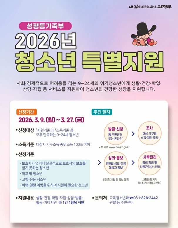 의정부시가 사회·경제적 어려움에 놓인 청소년을 지원하기 위한 '청소년 특별지원 사업' 대상자를 모집한다.