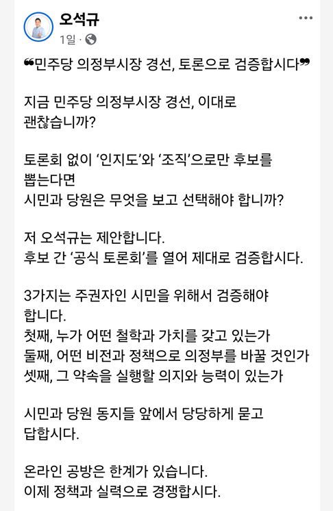 오 예비후보는 4일 자신의 사회관계망서비스(SNS)를 통해 "지금 민주당 의정부시장 경선, 이대로 괜찮느냐"고 반문하며 "토론회 없이 '인지도'와 '조직'으로만 후보를 뽑는다면 시민과 당원은 무엇을 보고 선택해야 하느냐"고 문제 제기했다.